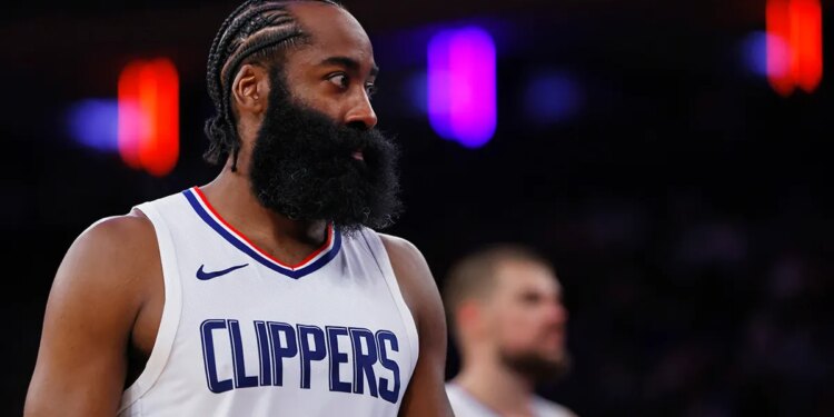 James Harden (1) of the LA Clippers in action against the New York Knicks during a game at Madison Square Garden on November 6, 2023, in New York City. The Knicks defeated the Clippers 111-97. (Rich Schultz/Getty Images)