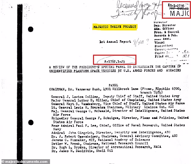 The documents allege that a group of 12 high-ranking military and scientific officials secretly spent more than two decades investigating crashed alien craft, studying non-human technology and attempting to communicate with extraterrestrials.