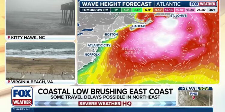 The FOX Forecast Center said that the core of the system will remain safely offshore as it delivers light to moderate rain to communities along the East Coast from the Outer Banks in North Carolina to the Northeast.