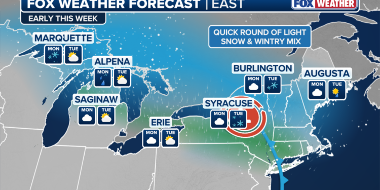While overall totals are expected to remain light, 1 to 3 inches of snow is possible, with slightly higher amounts near the Great Lakes and the higher terrain of the Adirondacks.