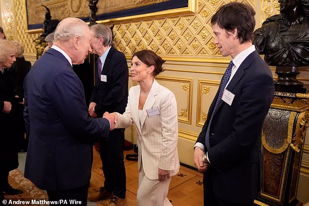 Coleen Rooney cut a sophisticated figure in a cream pinstripe suit as she greeted King Charles during a reception highlighting the inspirational work of paid and unpaid carers at Windsor Castle on Wednesday