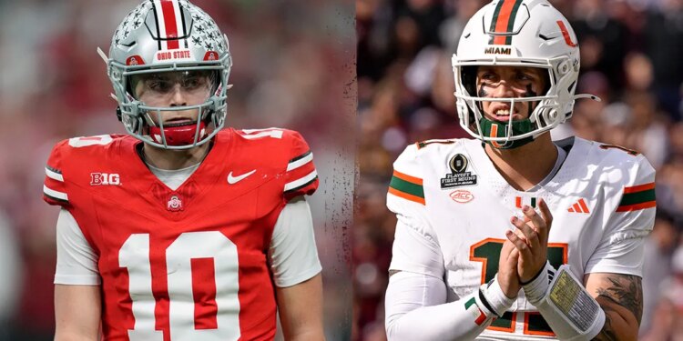(Left) Ohio State Buckeyes quarterback Julian Sayin (10) looks on against the Indiana Hoosiers during the 2025 Big Ten championship game at Lucas Oil Stadium in Indianapolis, Indiana, on Dec. 6, 2025. (Right) Miami Hurricanes quarterback Carson Beck (11) looks on during the game between the Texas A&M Aggies and the Hurricanes at Kyle Field in College Station, Texas, on Dec. 20, 2025. (Aaron Doster/Imagn Images;Jerome Miron/Imagn Images)