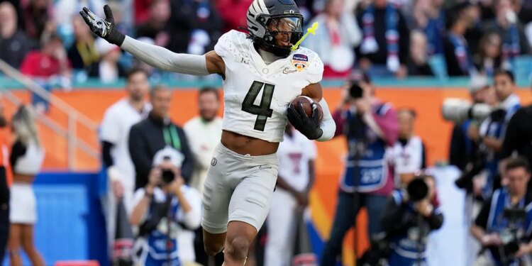 Oregon defensive back Brandon Finney (4) runs after intercepting the football during the first half of the Orange Bowl College Football Playoff quarterfinal game against Texas Tech in Miami Gardens, Florida, on Jan. 1, 2026. (Lynne Sladky/AP Photo)