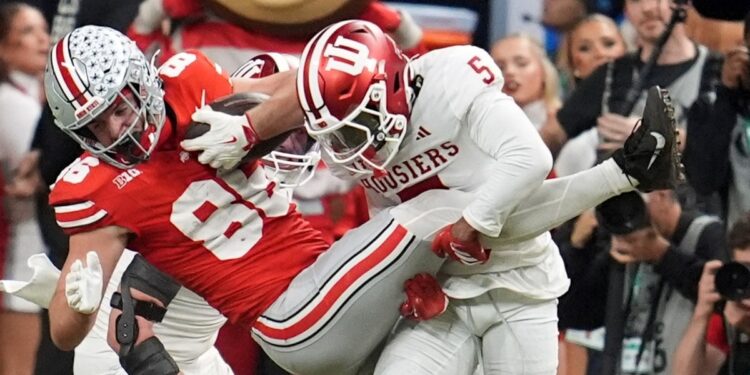 Indiana’s D’Angelo Ponds stops Ohio State’s Max Klare during the second half of the Big Ten championship NCAA college football game in Indianapolis, Saturday, Dec. 6, 2025. (AP Photo/Michael Conroy)