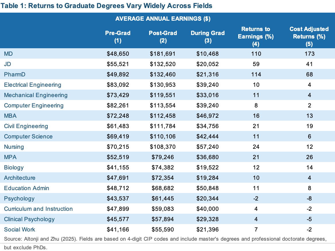 To calculate the estimates, researchers Altonji and co-author Zhengren Zhu, a professor at Vassar College, used administrative data from the Texas Education Research Center to develop causal estimates for 121 specific advanced degrees. The study moves beyond salary comparisons by accounting for a student’s outside options—the estimated earnings they would have achieved had they not pursued the graduate degree.