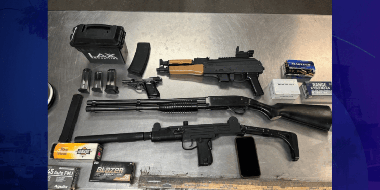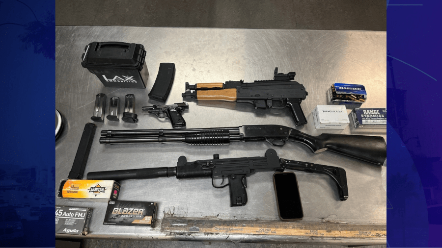 A search warrant was conducted on Burson’s Victorville home that turned up several firearms, including a short barrel rifle, a submachine gun, a 9 mm magazine and various ammunition.