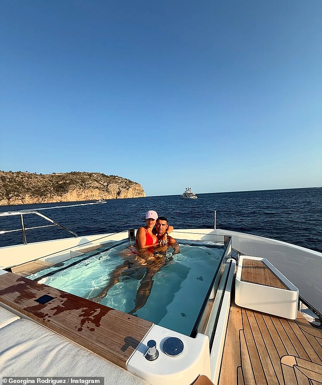 Ronaldo and his partner were cuddled up in the yacht's onboard hot tub in loved-up snaps, with Georgina sat on Cristiano's knee wearing a bright red bikini and cap