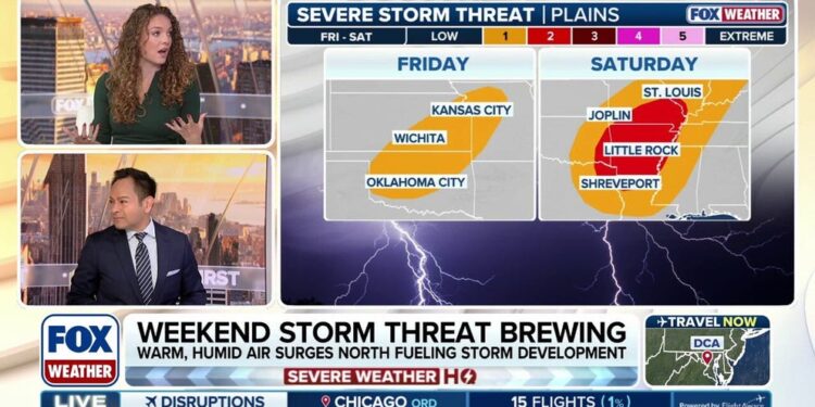 The severe weather system is expected to intensify Friday, first bringing scattered thunderstorms from Oklahoma to northwestern Missouri in the morning, while bringing a more significant afternoon threat to the Ark-La-Tex region, the Ozarks and the Mississippi Valley late Friday afternoon and into the evening.