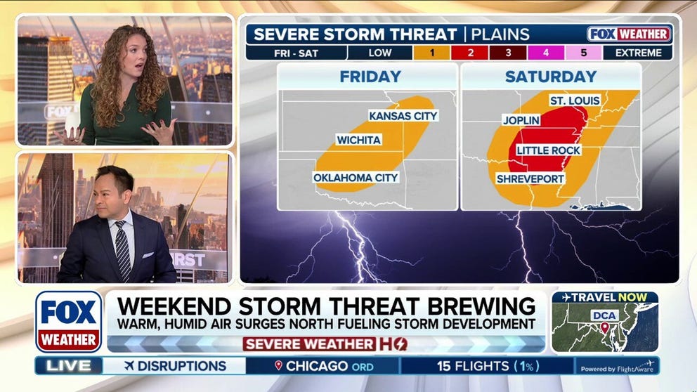 The FOX Forecast Center is monitoring a brewing severe storm threat for the Ozarks and Mississippi Valley this weekend. Tornadoes, damaging winds and large hail are all possible as a strong cold front sweeps across the country. This same system will bring days of heavy rain into the Northeast beginning Sunday.