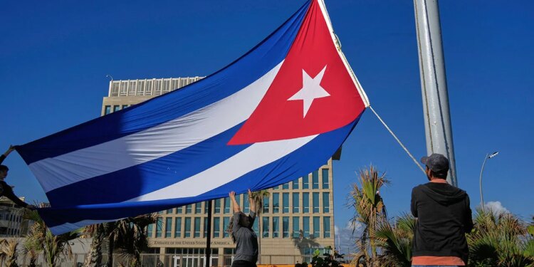 Workers fly the Cuban flag at half-staff at the Anti-Imperialist Tribune near the U.S. embassy in Havana Monday in memory of Cubans who died two days before in Caracas, Venezuela, during the capture of Venezuelan President Nicolás Maduro by U.S. forces.  (AP Photo/Ramon Espinosa)