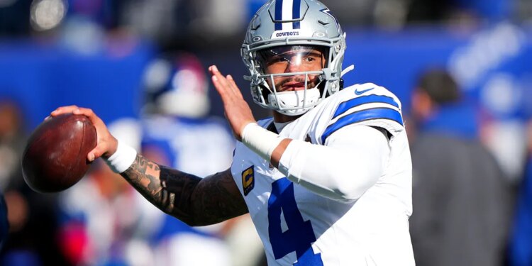Dallas Cowboys quarterback Dak Prescott (4) warms up before the game against the New York Giants at MetLife Stadium on Jan. 4, 2026. (Robert Deutsch/Imagn Images)