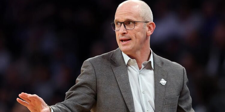 Head coach Dan Hurley of the Connecticut Huskies reacts in the first half of a quarterfinal game against the Villanova Wildcats during the Big East Men’s Basketball Tournament at Madison Square Garden on March 13, 2025 in New York City, New York. (Sarah Stier/Getty Images)
