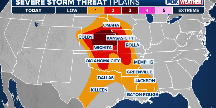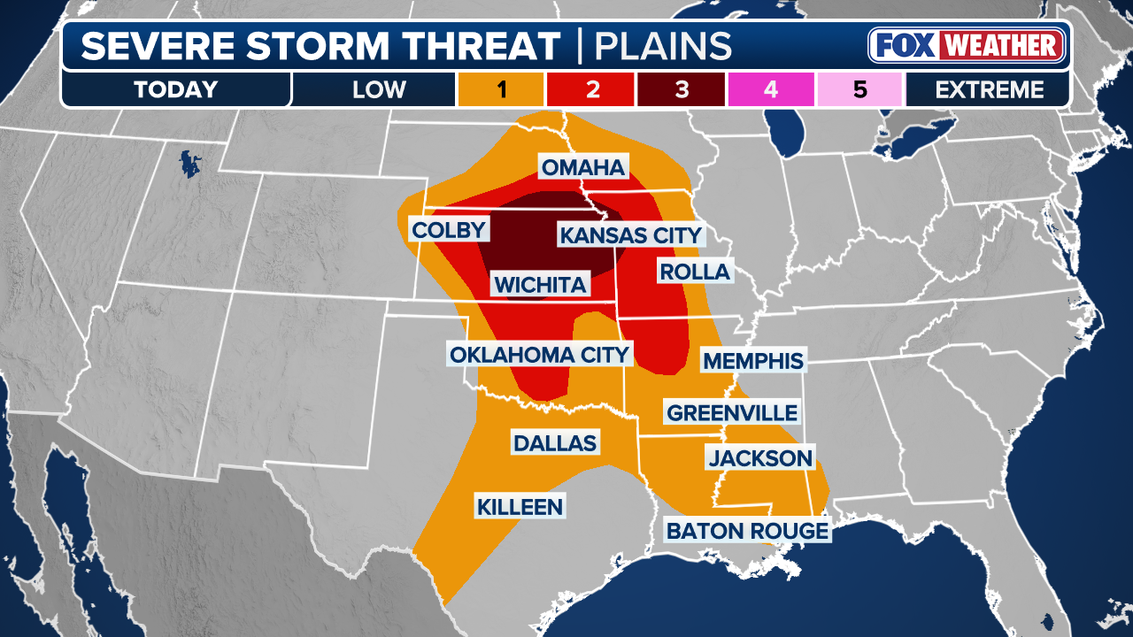 Parts of Kansas, Nebraska, and Missouri are under a Level 3 out of 5 severe storm threat, while a broader Level 2 risk extends into surrounding areas, including Oklahoma.