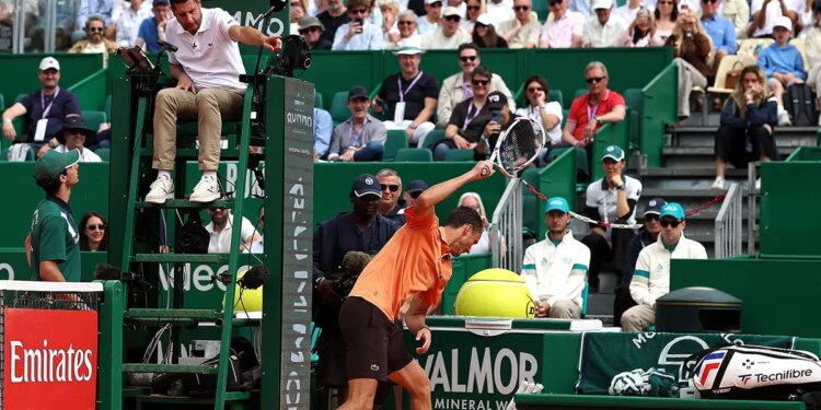 Russia’s Daniil Medvedev smashes his racket during a round of 32 match against Italy’s Matteo Berrettini at the Monte Carlo ATP Masters Series Tournament in Roquebrune-Cap-Martin, France, on April 8, 2026. (Valery Hache/AFP via Getty Images)
