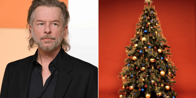 David Spade strikes a funny pose in front of a Christmas tree.