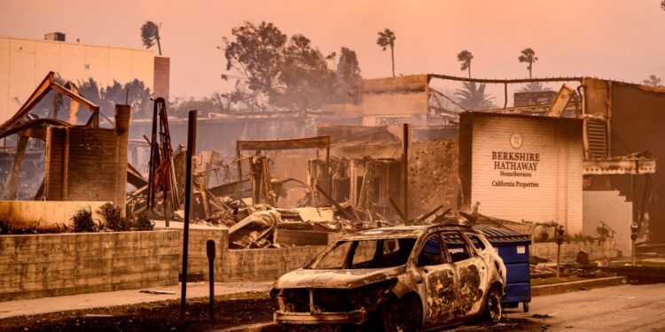 A Berkshire Hathaway office is left in smoldering ashes during the Palisade fire in the Palisade village area Pacific Palisades, a neighborhood of Los Angeles, California, January 8, 2025. The terrifying blazes leveled whole streets, torching cars and houses in minutes. More than 1,000 buildings have burned in multiple wildfires that have erupted around America’s second-biggest city, forcing tens of thousands of people from their homes. (Photo by JOSH EDELSON/AFP via Getty Images)