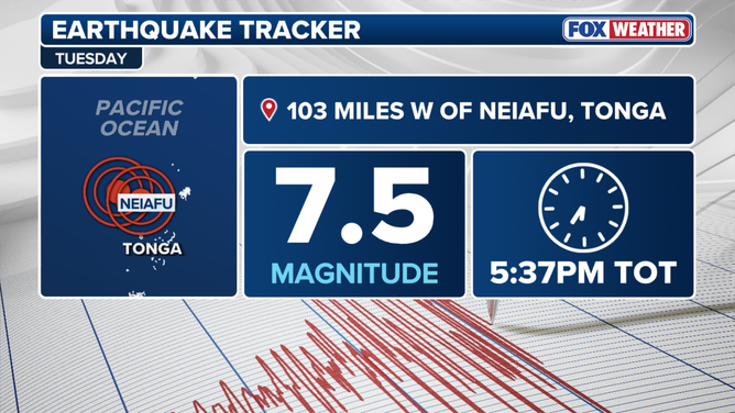 A magnitude 7.5 earthquake was detected some 148 miles below the surface of the Pacific Ocean roughly 103 miles west of Neiafu, Tonga.