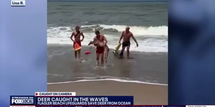 FLAGLER BEACH, Fla. – Lifeguards rescued a young deer from the ocean off the Central Florida coastline Sunday after beachgoers spotted the animal struggling in the surf.