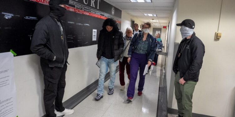 And as soon as they would leave the courtroom, they would be arrested by ICE agents or federal agents, frequently with masks. Nationwide, it’s estimated that there were over 2,000 arrests in this manner. Some of the courts were quite chaotic, arresting people in hallways. People were being trapped in elevators. Journalists were being rough-handled, scenes of fathers being torn from their children, women begging federal agents to let their husbands go.