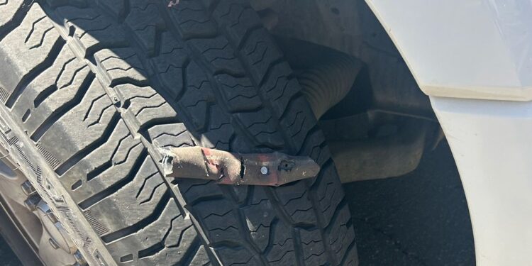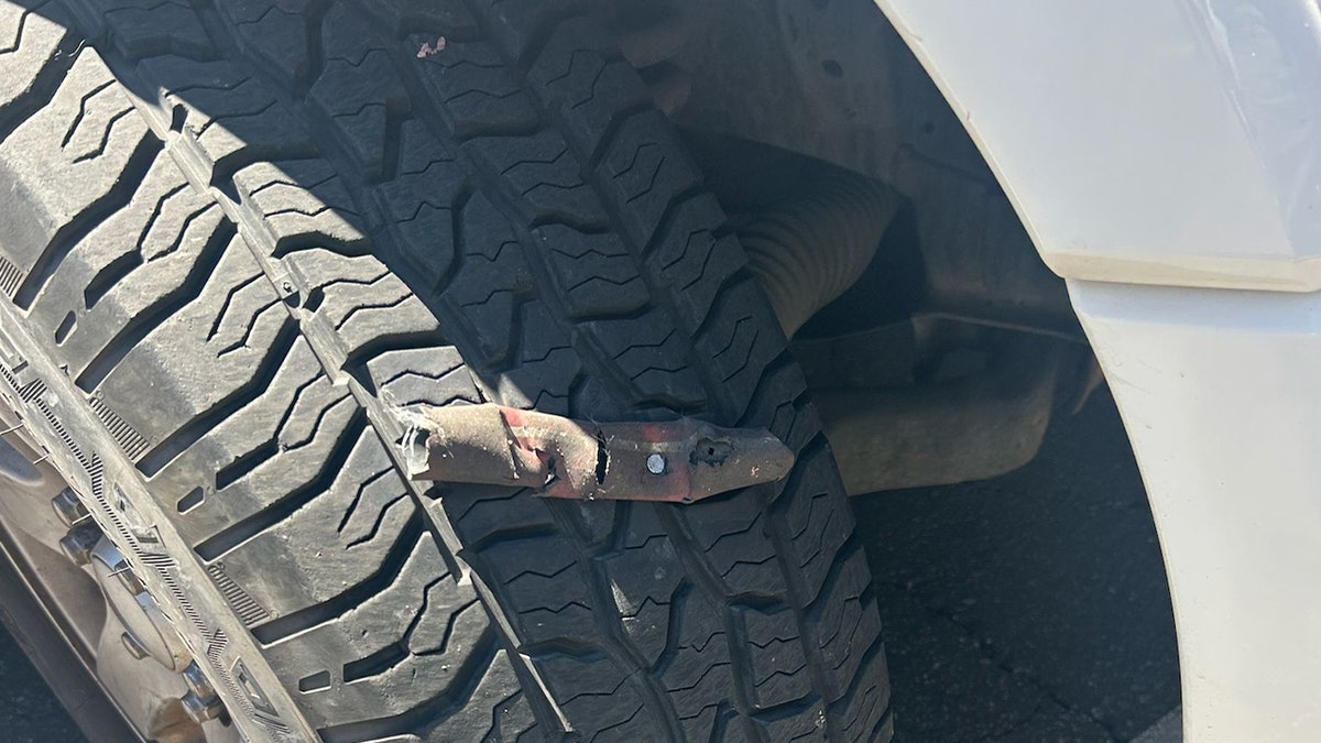 A Border Patrol vehicle tire punctured by a “homemade” device with nails on Tuesday in Van Nuys, California. (@USBPChiefELC/X)