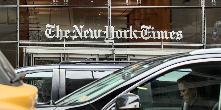 Cars and taxi cabs travel past The New York Times sign above the entrance to the newspaper’s corporate headquarters in Times Square in New York City Jan. 27, 2023. (Yuriy T/iStock)