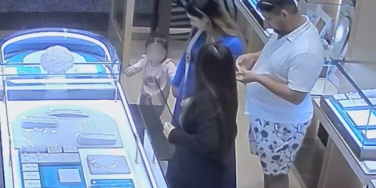 In footage of the incident, the female suspect is seen standing in front of a display case with what appears to be a velvet board holding several necklaces next to the store employee. It then looks like the male suspect, somewhere behind the woman, asks a question of the salesperson.