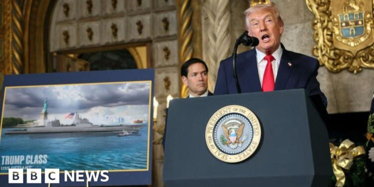 Reuters Donald Trump speaking at a podium in Mar-a-Lago. He is wearing a dark navy blue suit with a bright red tie. Behind him is Secretary of State Marco Rubio. Beside him is a big photo featuring a rendering of Trump Class USS Defiant. Hie is standing in a room with ornate, gold accents behind him. Reuters