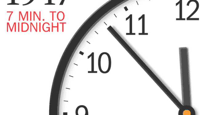 The “Doomsday Clock” is a symbolic time set by the Bulletin of the Atomic Scientists that represents how close humanity is to destroying our own world through disruptive technologies. It was created in 1947 during the Cold War, when the United States and the Soviet Union were heading into a nuclear arms race in full force.