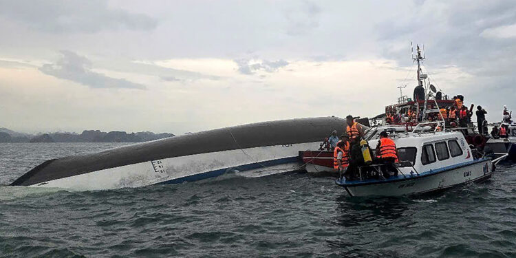 A tourist boat capsized with 48 people on board, including at least 20 children, during a sudden storm in Ha Long Bay,