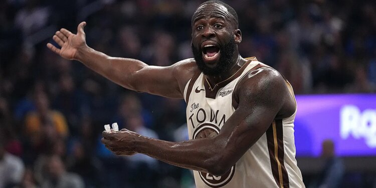 Golden State Warriors forward Draymond Green yells at the referee during the first half of an NBA basketball game against the Orlando Magic, Monday, Dec. 22, 2025, in San Francisco (AP Photo/Justine Willard)