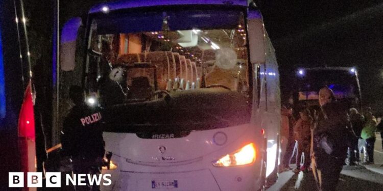 Driver dies after Italian basketball fans’ bus attacked with stones