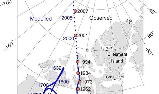 For most of the past 600 years, the pole has been wandering around over northern Canada. It was moving relatively slowly, around six to nine miles per year, until around 1990, when its speed increased dramatically, up to 34 miles per year.