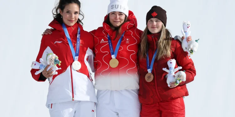 Gold medalist Mathilde Gremaud of Switzerland, silver medalist Eileen Gu of China, and bronze medalist Megan Oldham of Canada pose on the podium after the women’s freeski slopestyle final on Feb. 9, 2026. Ian MacNicol—Getty Images