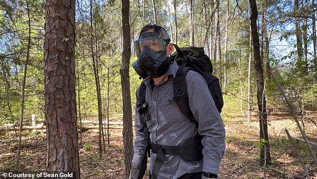 Sean Gold, pictured in gas mask, started his disaster-prepping website TruePrepper in 2016 after the birth of his first child