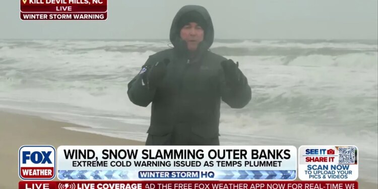 A photo shows snow falling on the beaches of Rodanthe, North Carolina on Jan. 31, 2026 as a powerful nor’easter brews off the Southeastern coast.