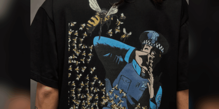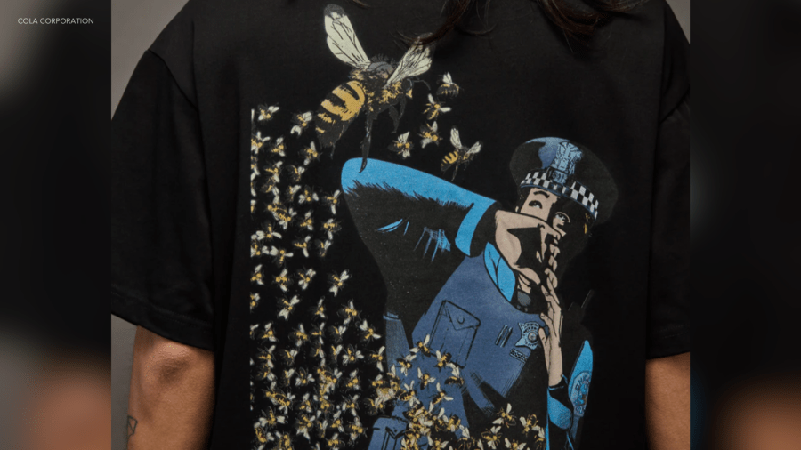 One of the designs features a bee on the front and what appears to be a Chicago police officer cowering in fear of a swarm of bees on the back.