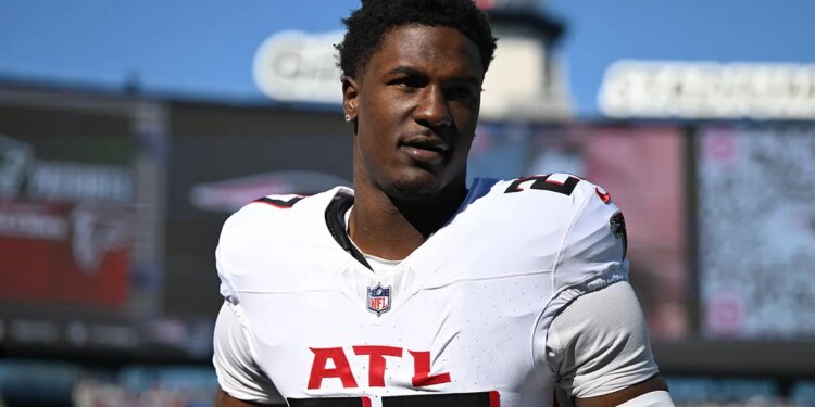 Atlanta Falcons linebacker James Pearce Jr. warms up before a game against the New England Patriots at Gillette Stadium Nov. 2, 2025. (Brian Fluharty/Imagn Images)