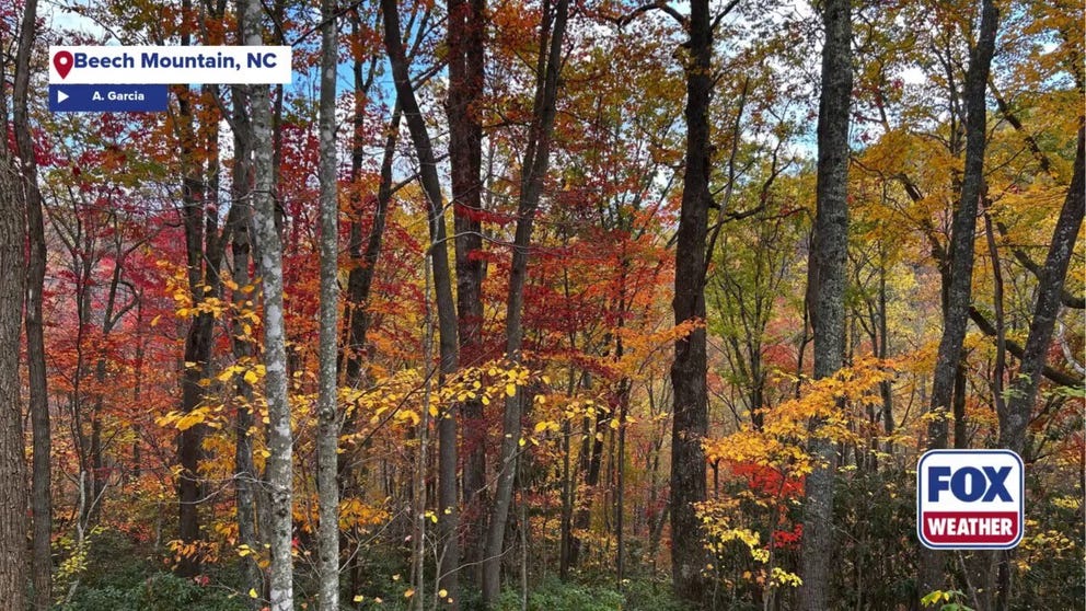 Photos from October 2025 show fall colors are nearing peak conditions in Beech Mountain, North Carolina along the Blue Ridge Parkway.