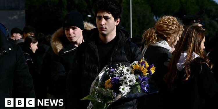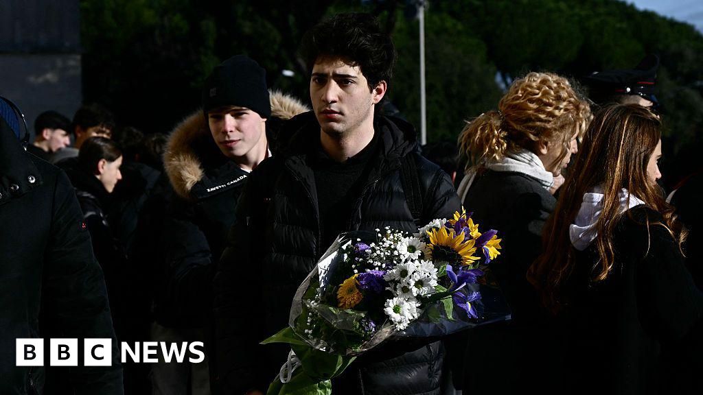 AFP via Getty Images A young man wearing black holds a bouquet of flowers outside a church in Rome before the funeral of Riccardo Minghetti, one of the Italian victims of the Crans-Montana new year fire.AFP via Getty Images