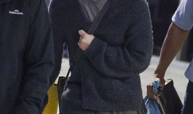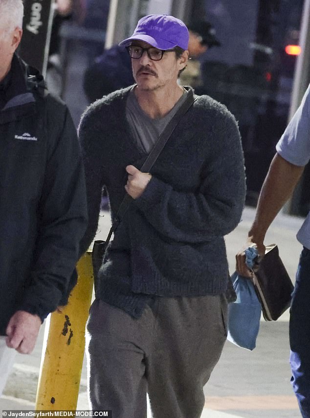 Pedro, 50, also known for his roles in The Last of Us and The Mandalorian, cut a low-key figure in an oversized charcoal knit, matching pants and a deep purple baseball cap.