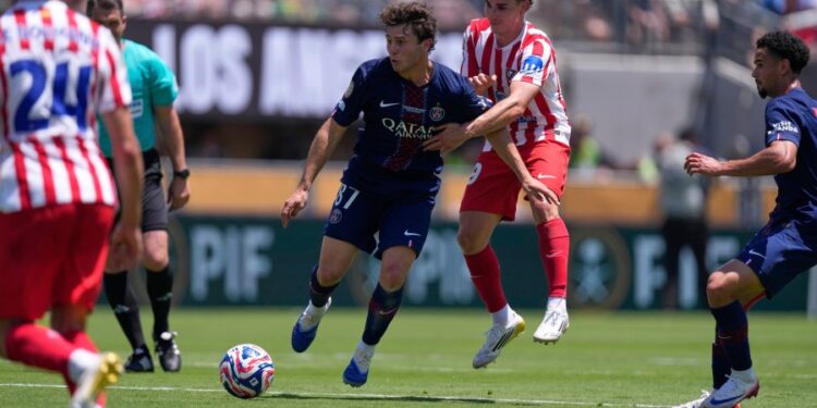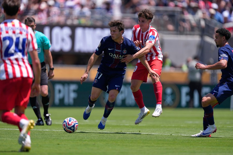 Paris Saint-Germain’s Joao Neves, left, vies for the ball with Atletico Madrid’s Julian Alvarez during the Club World Cup group B soccer match between PSG and Atletico Madrid, in Pasadena, Calif., Sunday, June 15, 2025. (AP Photo/Mark J. Terrill)