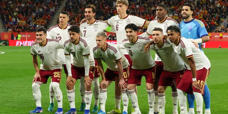 Spain players line up before the international friendly football match between Spain and Egypt at RCDE Stadium in Cornella de Llobregat, near Barcelona, on March 31, 2026. (Lluis Gene/AFP)