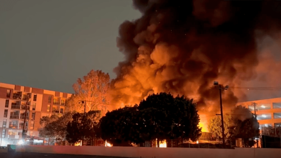 The intense flames from the “fully involved” structure initially kept firefighters in a defensive mode, the Los Angeles Fire Department posted in a news alert.