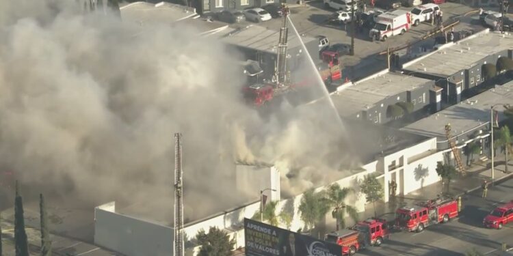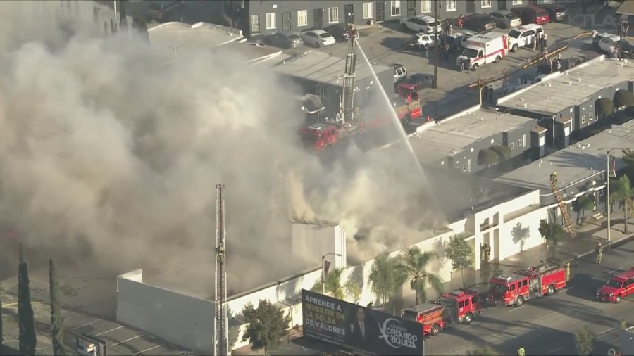 Los Angeles County Fire crews took a defensive approach to the blaze which caused a partial wall collapse. KTLA’s Gil Leyvas reported that firefighters took a surround-and-drown approach, hitting the flames from as many angles as possible to slow the spread and extinguish the blaze with hoses, ladder trucks and water cannons.