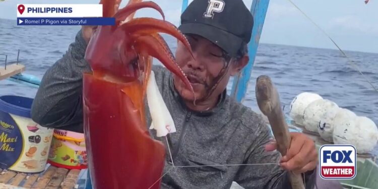A video shows the messy encounter as fisherman Romel P. Pigon reels in the bright orange and red squid from the ocean. Right before he brings up the catch, the squid delivers a blast of ink right into Pigon’s face.