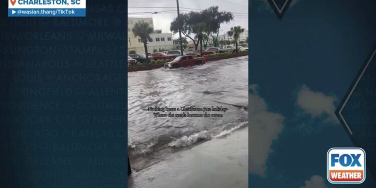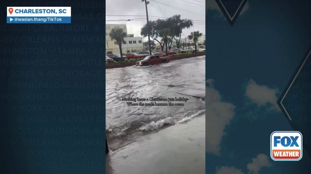 A TikTok video shared from Charleston, South Carolina, shows vehicles trying to drive through floodwaters on Aug. 11, 2025.