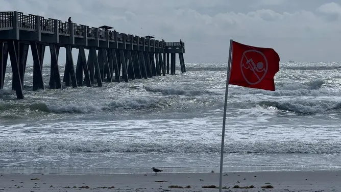 Heavy surf pounds Jacksonville Beach, Florida on June 21, 2024.