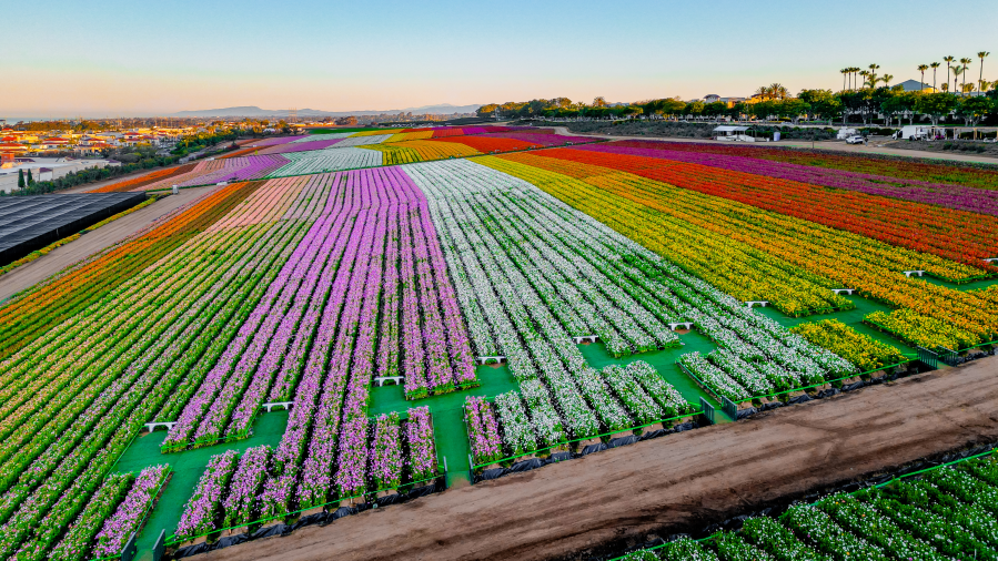 The Flower Fields at Carlsbad Ranch are located at 5704 Paseo Del Norte in Carlsbad.