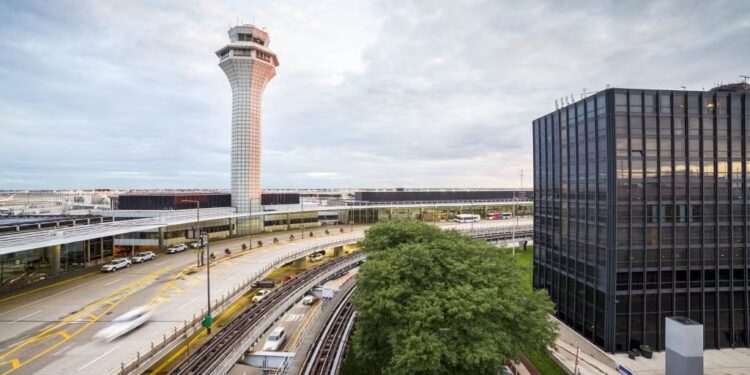 Air traffic control tower and multilevel infrastructure in Chicago International Airport.