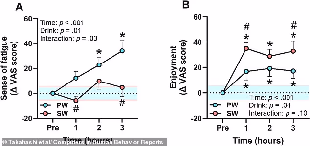 The team found that participants reported less fatigue and more enjoyment when they drank the sparkling water (SW) compared to plain water (PW)